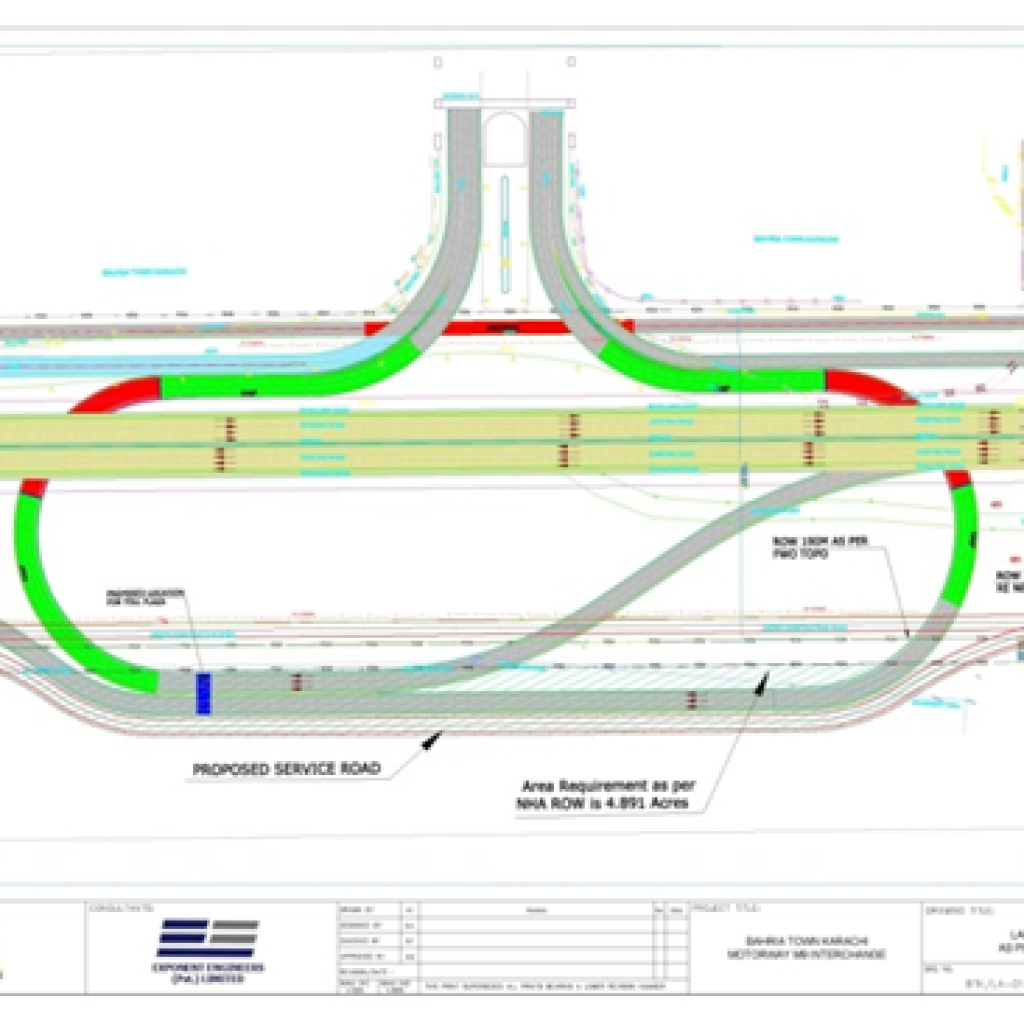 - Detailed Design of Interchange on M-9 Motorway in front of Bahria Town Karachi (underpasses, bridges, causeways and access roads along with storm water drainage design, design of pumping stations and electrification etc.).